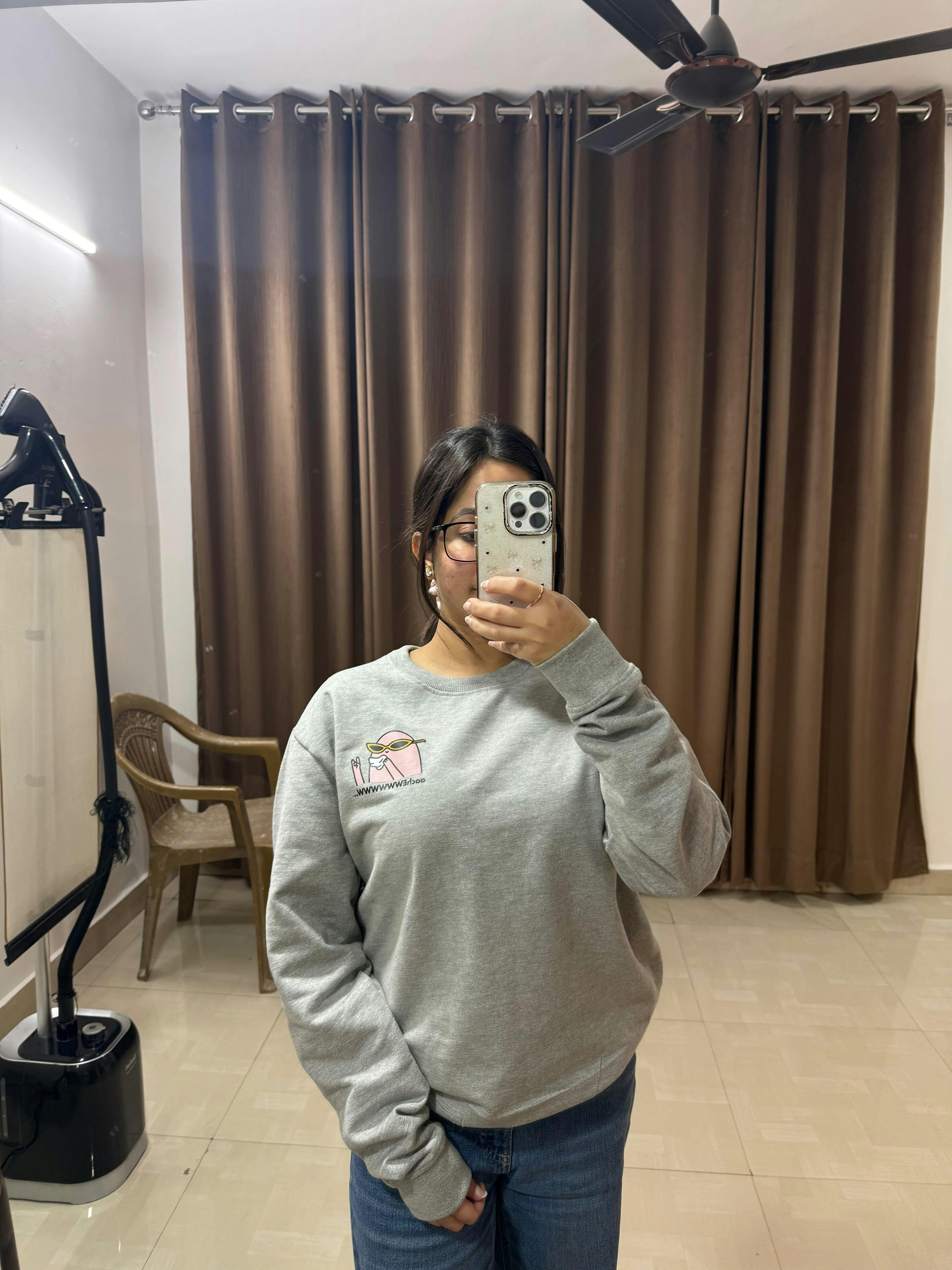 Meet the sweatshirt that throws shade so you don’t have to, embroidered with a tiny, too-cool chick rocking sunglasses and serving a dramatic “oooch EWWWWWW…” energy - perfect for days when your vibe is 70% cute, 30% over it