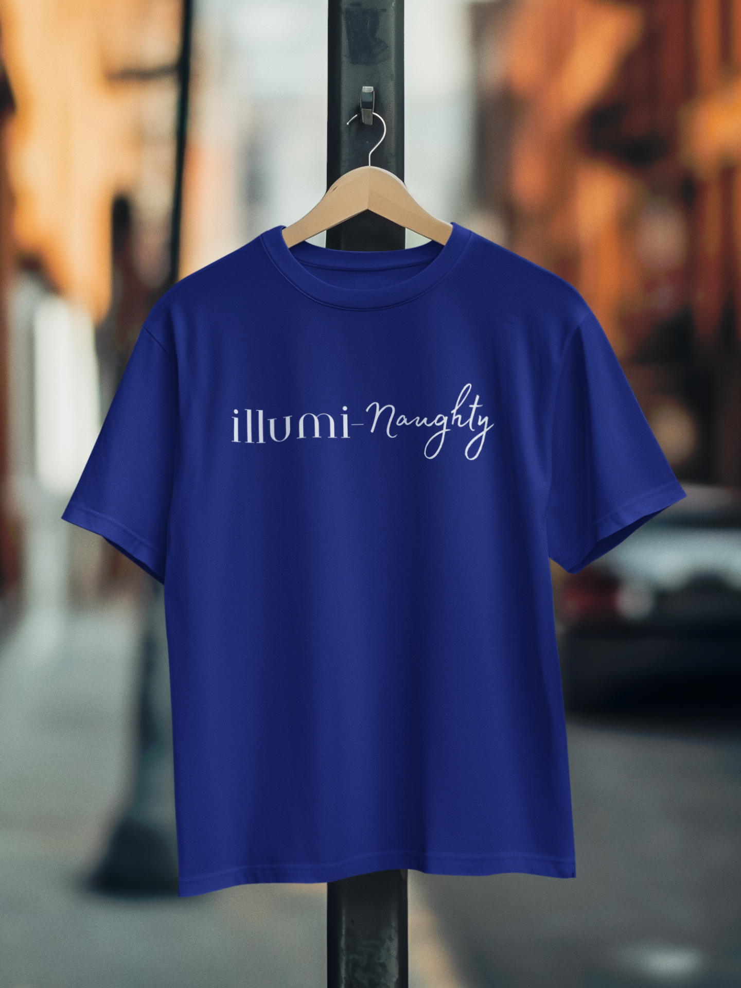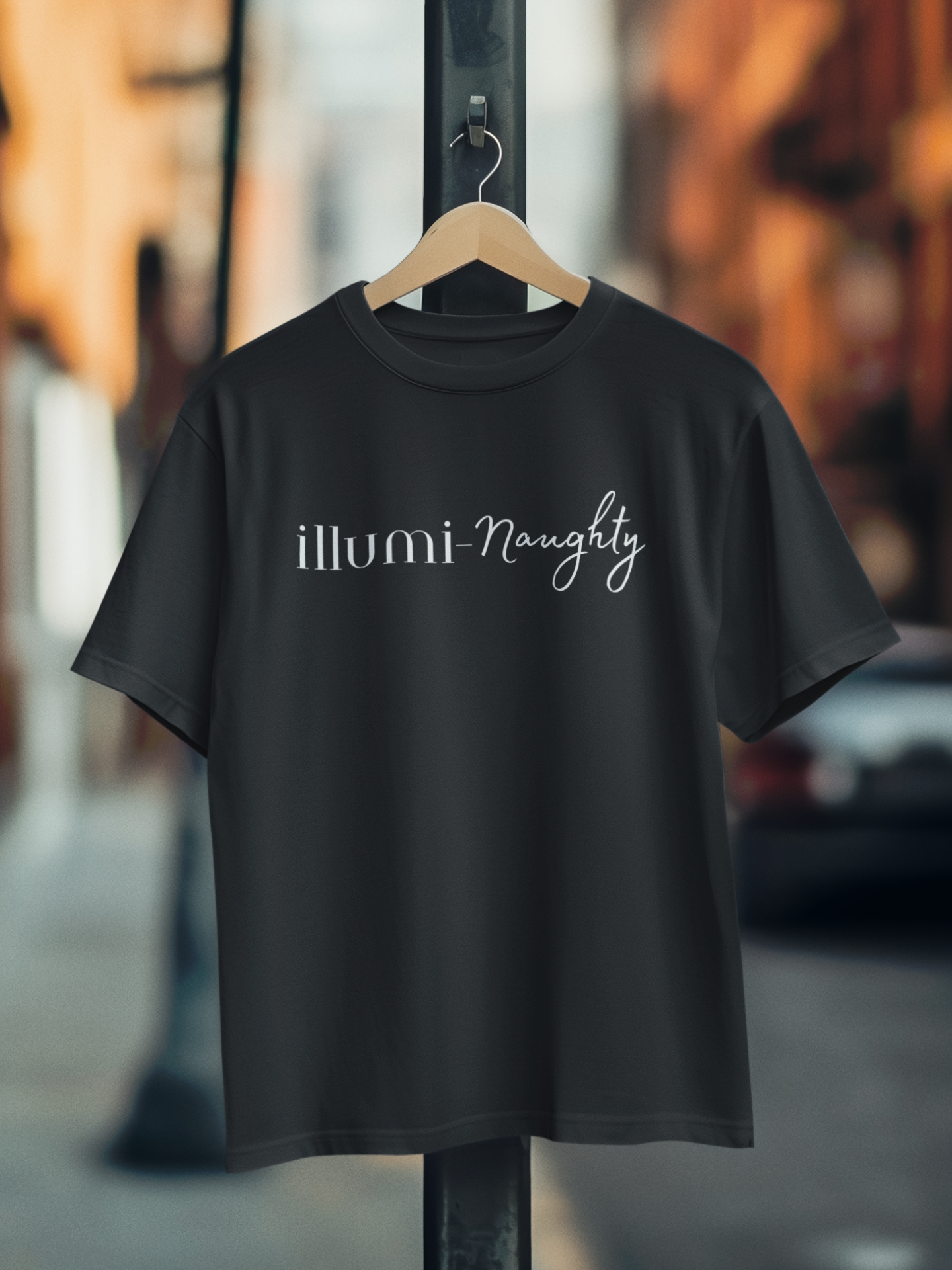 Not just lit - straight up naughty. The illumi-Naughty tee blends cheeky wordplay with bold attitude, making it the perfect pick for when you want your outfit to do the flirting